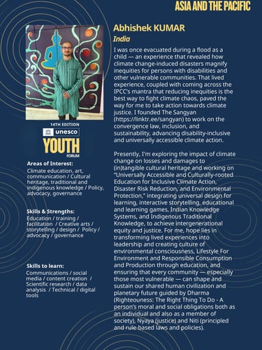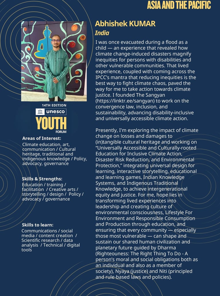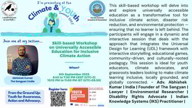 The Action Project, “Universally Accessible and Culturally-Rooted Education for Inclusive Climate Action, Disaster Risk Reduction, and Environmental Protection,” led by Adv. Abhishek Kumar from India, Founder and Curator of The Sangyan, is embedding the mantra that the "best way to give effective and lasting protection from climate chaos is through action that addresses inequities such as those based on gender, ethnicity, disability, age, location, and income". It envisions education as both an enabler and an equaliser in the face of the global climate crisis. It seeks to bridge the often-separated realms of culture and accessibility—rooting climate action within local wisdom while ensuring universal inclusion through design and policy.