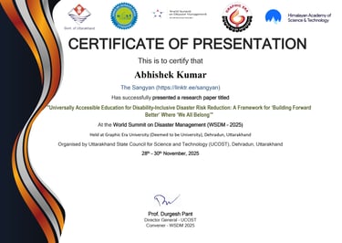 Certificate of Participation: Successfully presented a research paper titled "Universally Accessible Education for Disability-Inclusive Disaster Risk Reduction: A Framework for ‘Building Forward Better’ Where ‘We All Belong’" at the World Summit on Disaster Management (WSDM – 2025) held at Graphic Era University (Deemed to be University), Dehradun, Uttarakhand. Organised by Uttarakhand State Council for Science and Technology (UCOST), Dehradun, Uttarakhand (28th – 30th November, 2025)