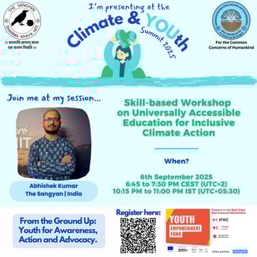 The Climate & YOUth Summit 2025 — From the Ground Up: Youth for Awareness, Action and Advocacy provided a global platform to highlight inclusive and transformative approaches to climate action. At the plenary session, Adv. Abhishek Kumar from India, representing The Sangyan, organised and facilitated a skill-based workshop on “Universally Accessible Education for Inclusive Climate Action.” This interactive session explored education as a force multiplier for inclusive climate action, disaster risk reduction, and environmental protection — ensuring that no learner is left behind.