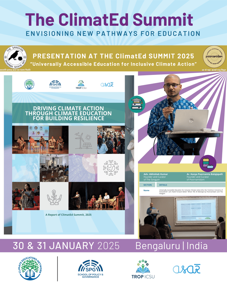 Adv. Abhishek Kumar represented the collaborative initiative by The Sangyan and Poornamidam, and made a presentation on "Universally Accessible Education for Inclusive Climate Action". The presentation emphasised that "universally accessible education is sine qua non in achieving inclusive climate action" and highlighted that to address the 'Common Concerns of Humankind' (Re, Sustainable Development Goals, Triple Planetary Crisis, and Polycrisis): we shall ‘Build Forward Better’ (Climate-Resilient and Sustainable) Where ‘We All Belong’ (Equitable, Inclusive, and Universally Accessible) to attain inter-generational equity and justice.