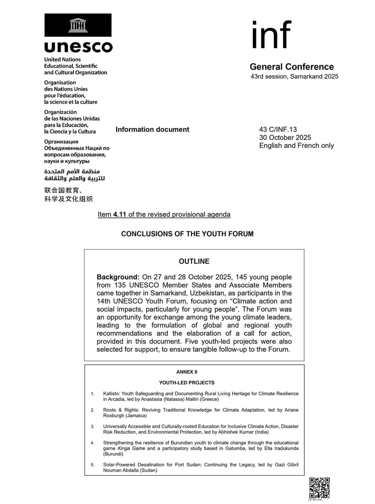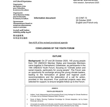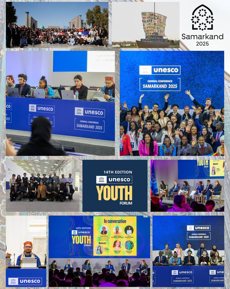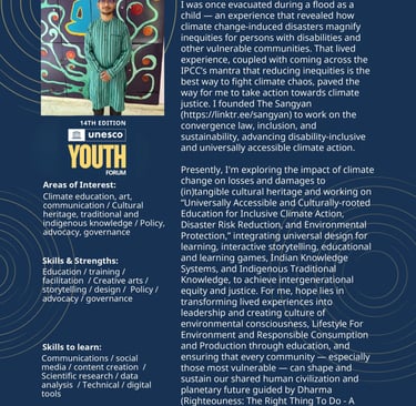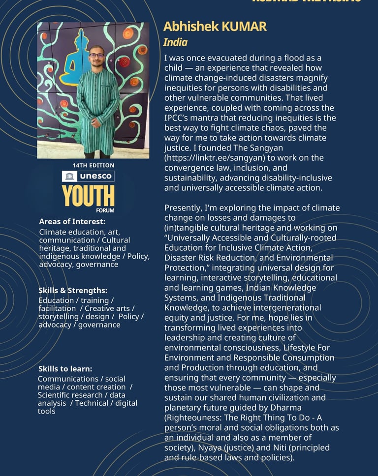 Youth Delegate Representing India at the 14th Edition of the UNESCO Youth Forum 2025 in Samarkand (Uzbekistan) and Selection of the Action Project on "Universally Accessible and Culturally-rooted Education for Inclusive Climate Action, Disaster Risk Reduction, and Environmental Protection" (led by Abhishek Kumar of The Sangyan) under the UNESCO's Global Youth Grant Scheme (GYGS).